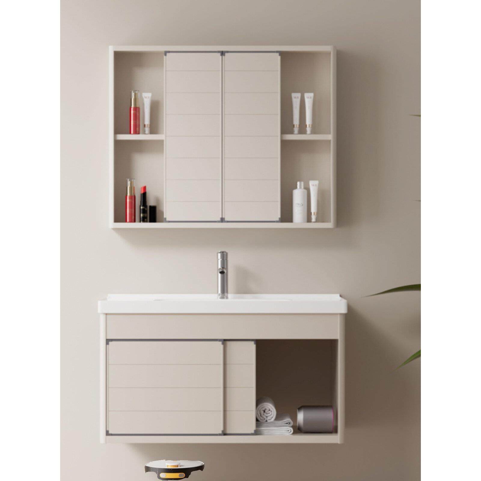 杭州萧山奶油风折叠推拉隐藏式实木风水镜柜浴室柜陶瓷一体盆组合