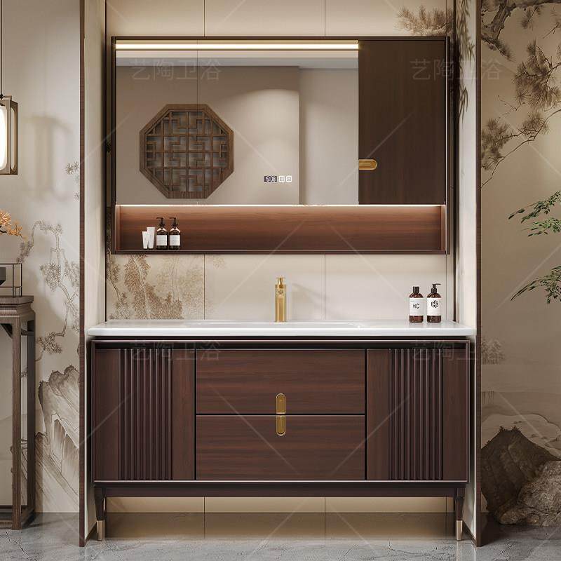 宋式美学新中式橡胶木风水镜柜浴室柜组合陶瓷一体盆洗漱台洗手池