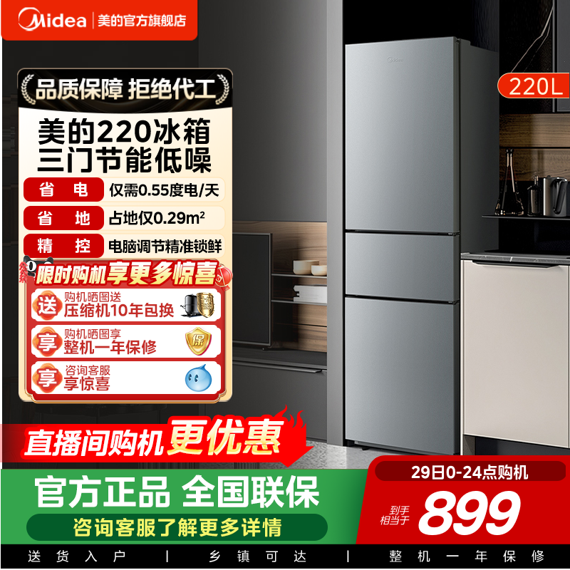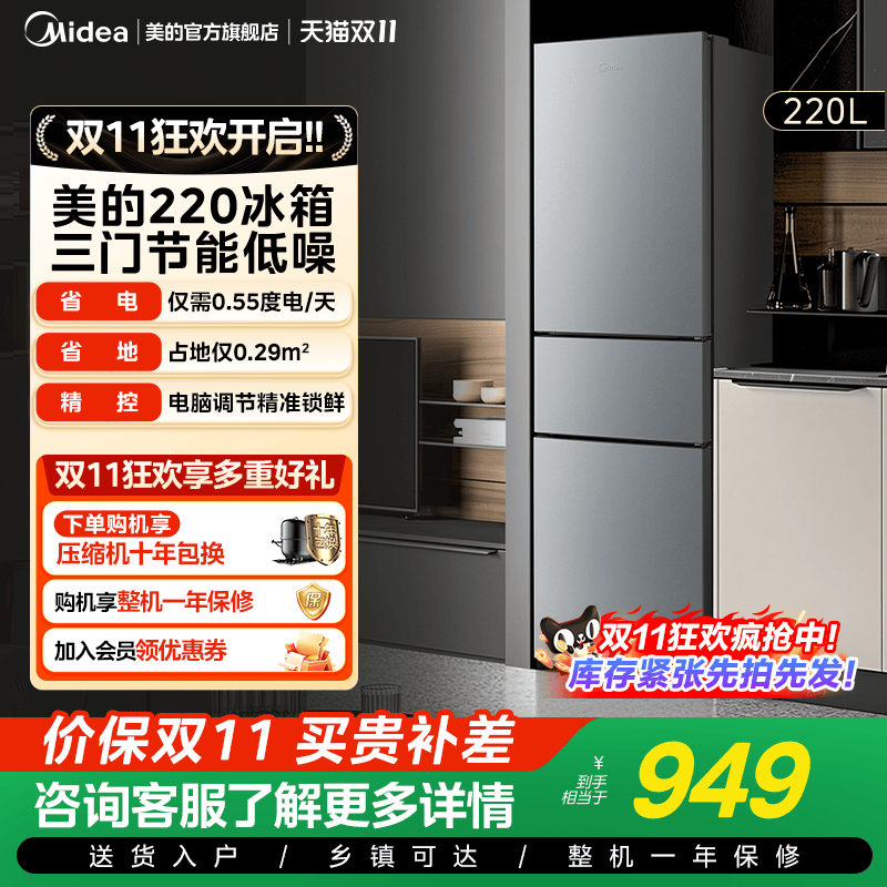 美的官方220L三门冰箱小型家用宿舍租房低噪冷冻冷藏节能冰箱