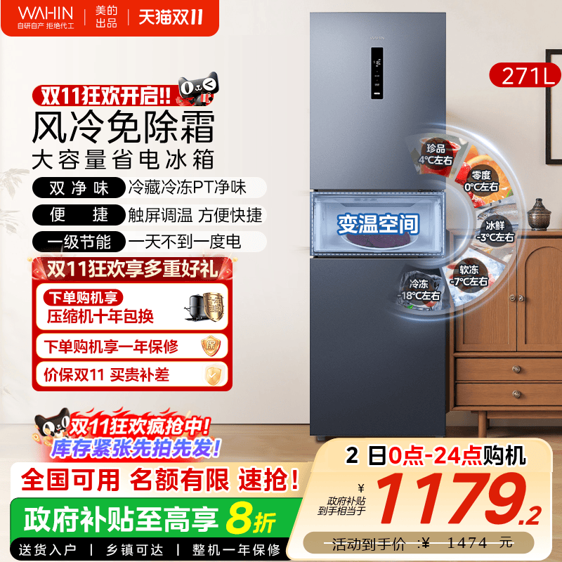 美的华凌282三开门冰箱家用小型变频一级能效节能风冷无霜租房