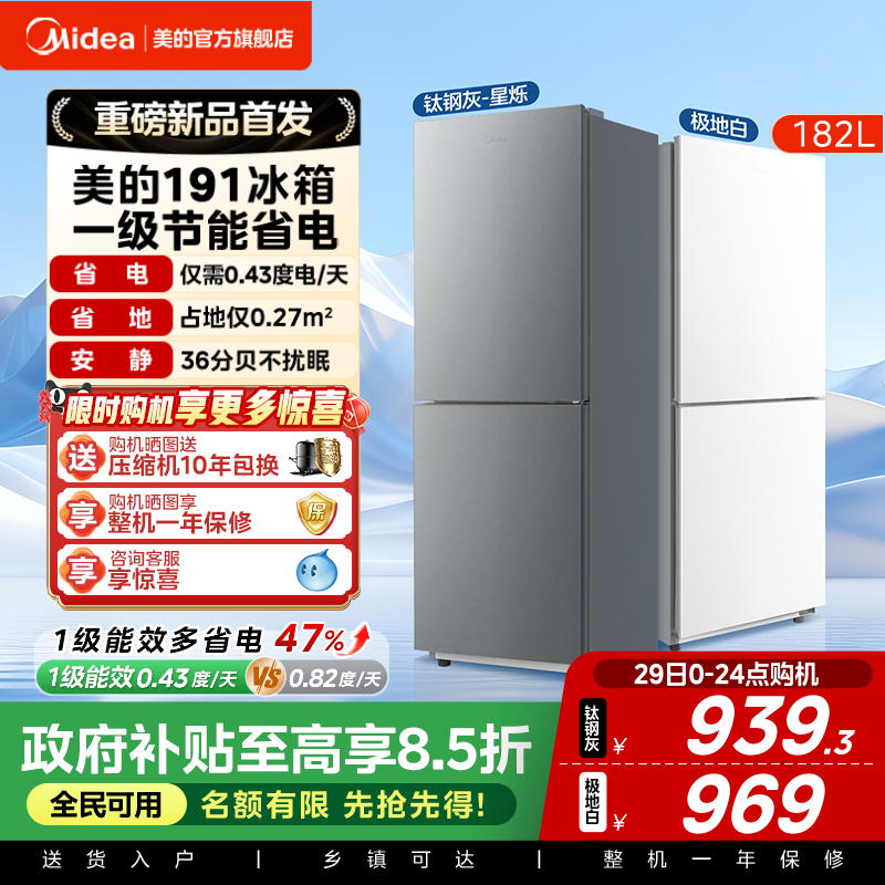 美的官方191租房宿舍低噪节能小型冰箱家用两门一级能效2026新款