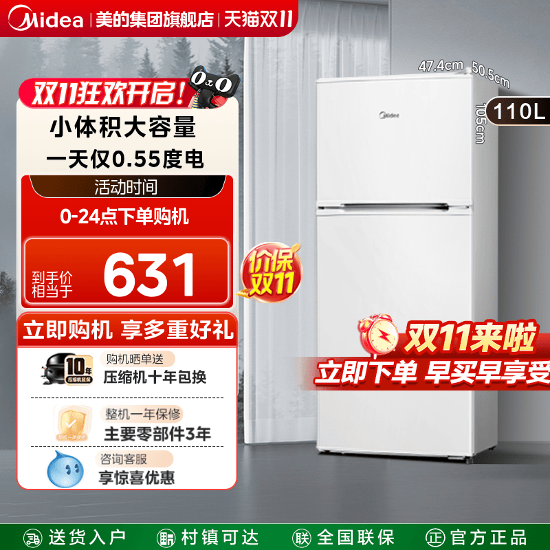 美的110L+双开两门家用小型冰箱宿舍租房迷你办公室节能官方正品