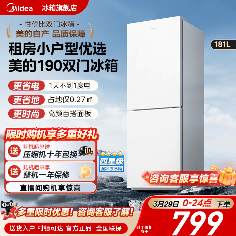 美的190双开门两门白色家用小型宿舍租房超薄电冰箱节能省电官方