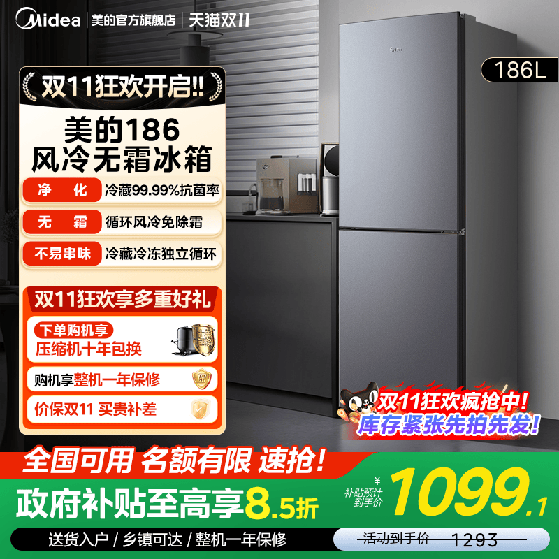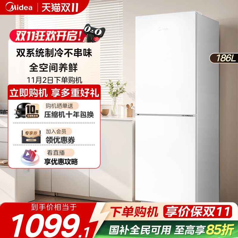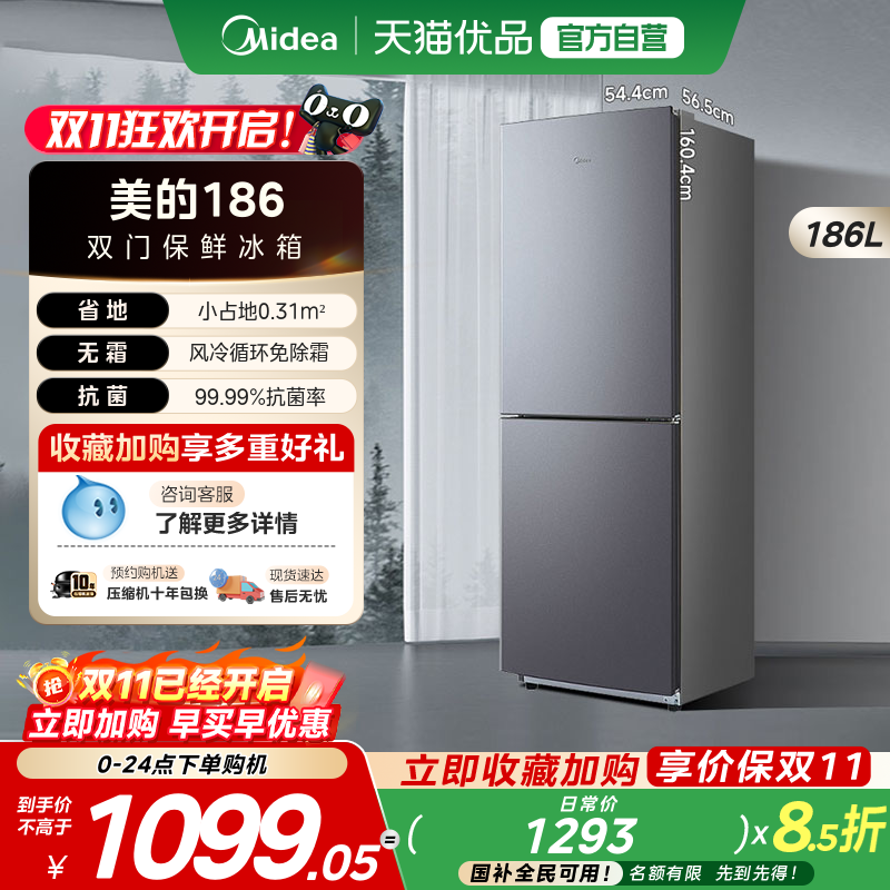 美的186风冷无霜双门两门家用电冰箱小户型节能低噪冷藏冷冻租房