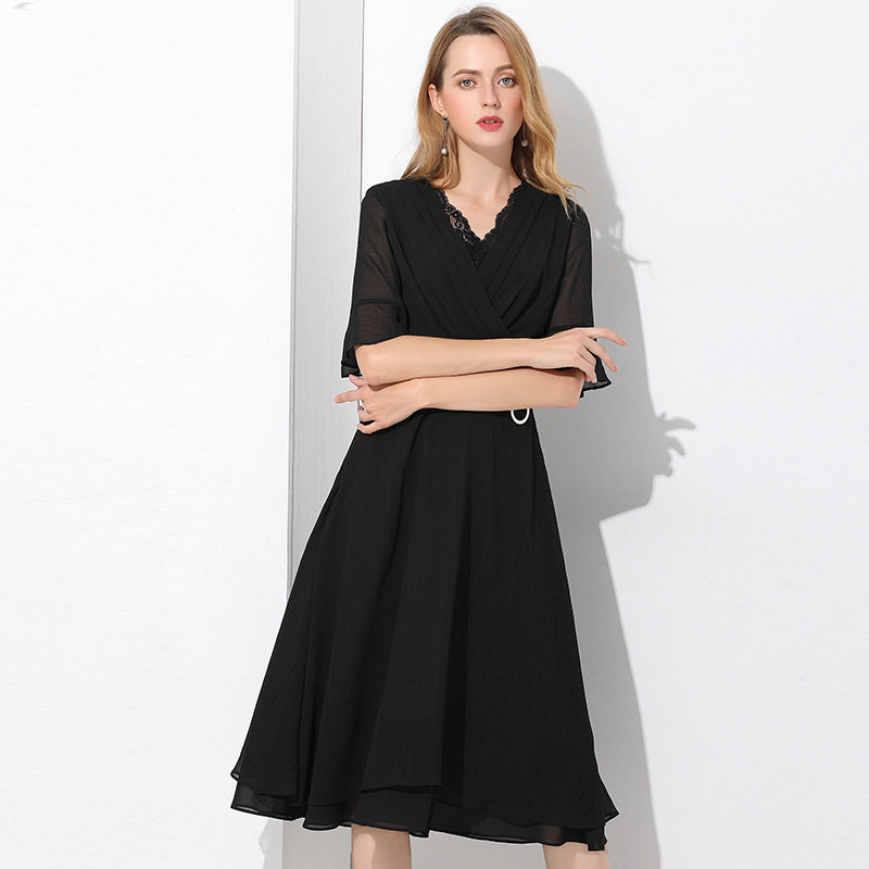 加大码女装蕾丝花朵V领收腰连衣裙加肥大码女装法式赫本风小黑裙