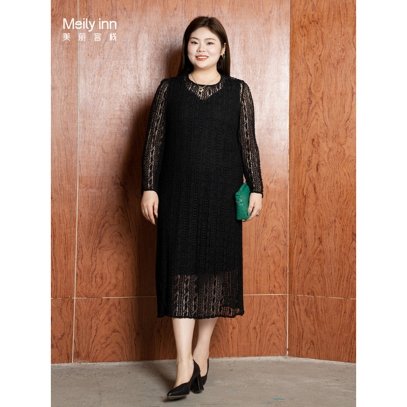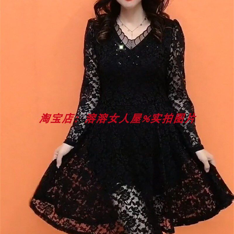 秋季打底裙加肥加大镂空秋冬大码连衣裙中长款长袖蕾丝打底衫女潮
