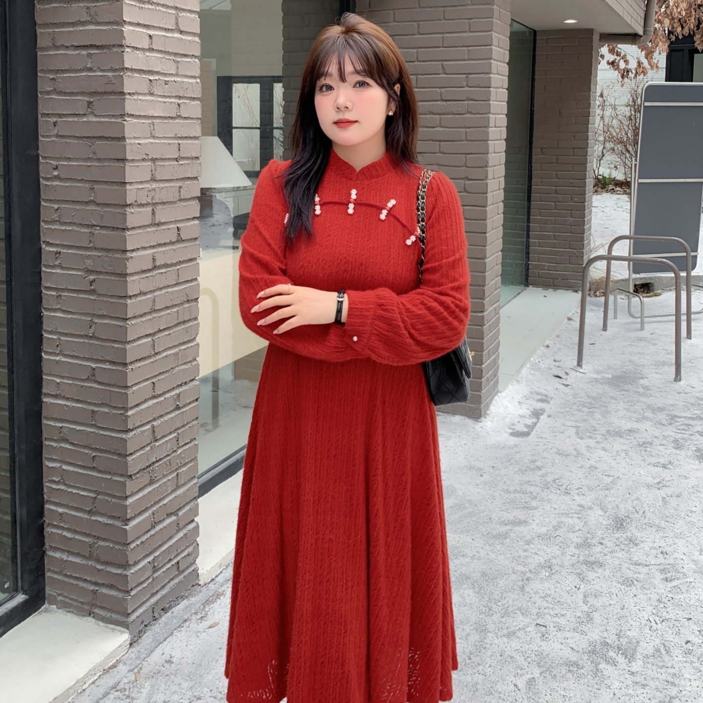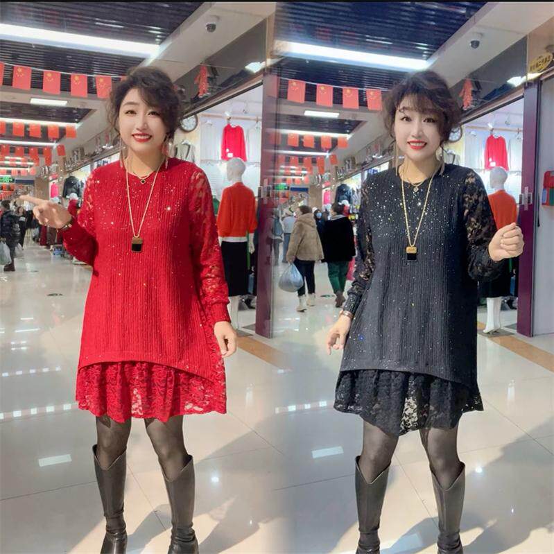 韩版大码女装加肥加大蕾丝针织中长显瘦长袖毛衣连衣裙秋冬打底裙