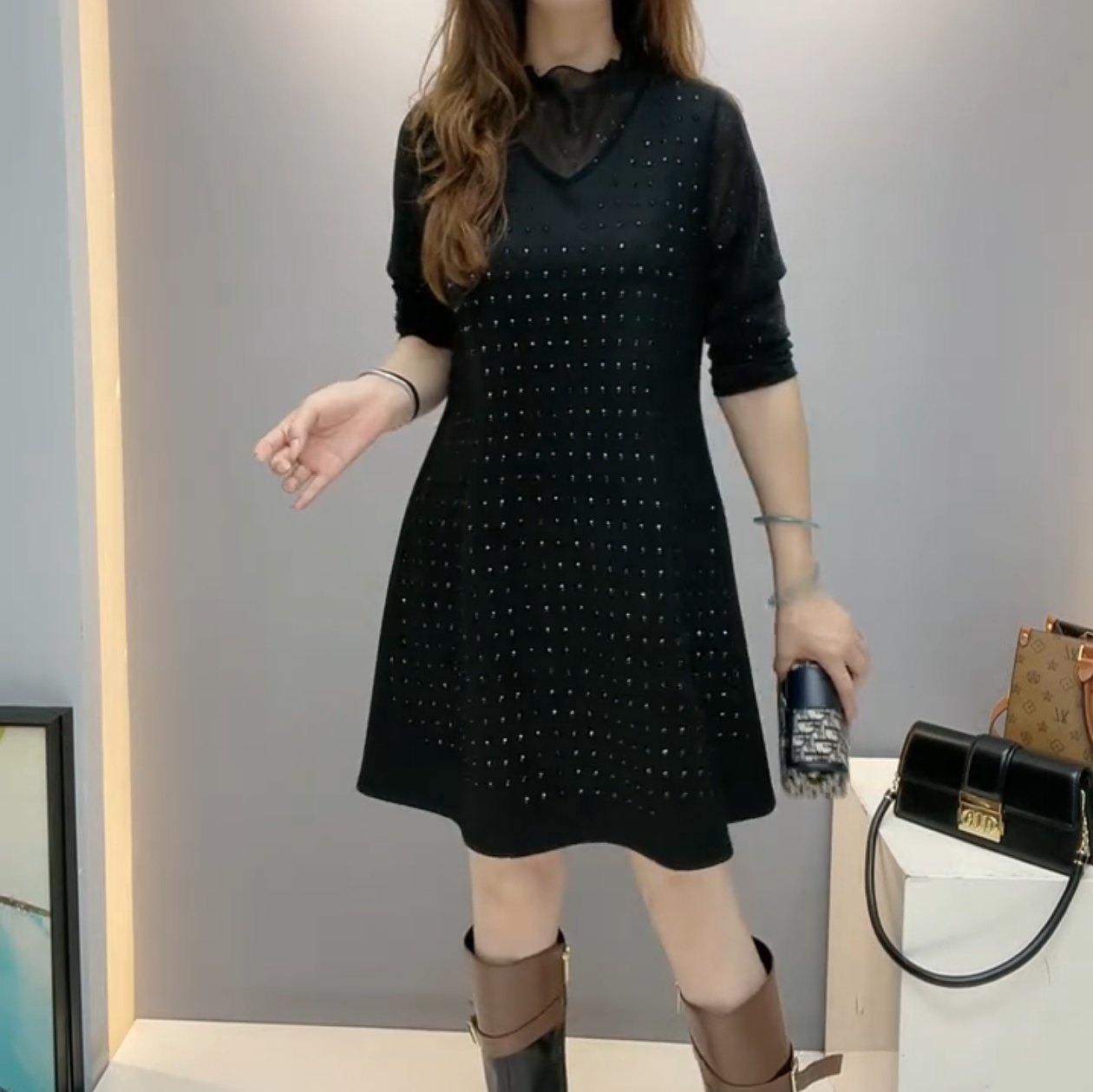 胖妹妹加肥加大码罗马棉烫钻连衣裙蕾丝长袖韩版遮肚子显瘦打底衫