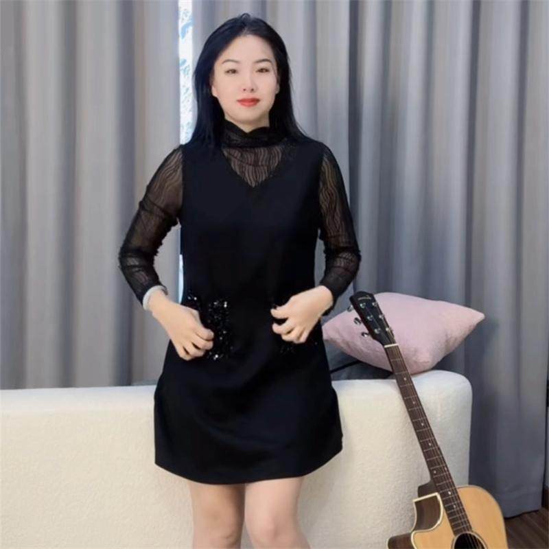 秋季时尚洋气女韩版加肥加大码拼接蕾丝长袖大黑钻连衣裙宽松显瘦