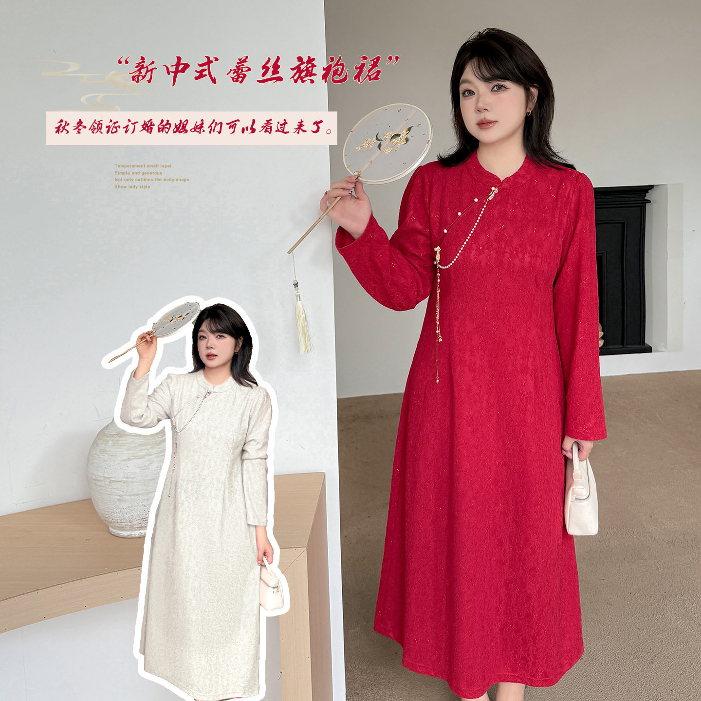 加肥加大大码女装200斤胖mm订婚领证旗袍裙蕾丝收腰连衣裙敬酒服