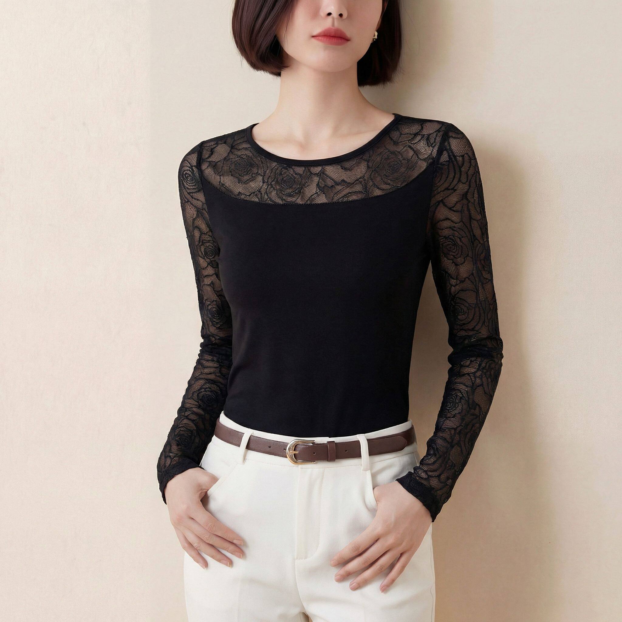 时尚镂空蕾丝打底衫女装春秋季新款上衣内搭长袖T恤黑色圆领小衫