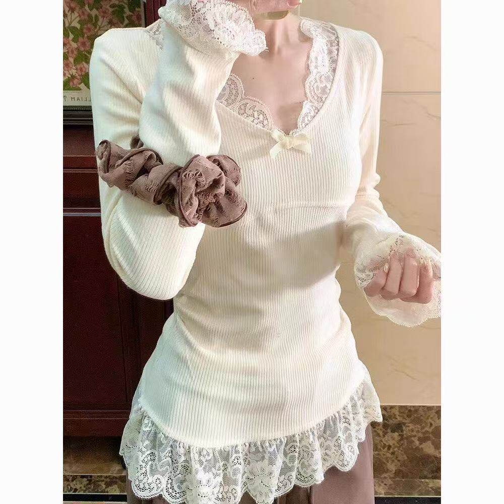 V领蕾丝打底衫女2026春秋季新款高级感毛衣内搭修身绝美长袖上衣