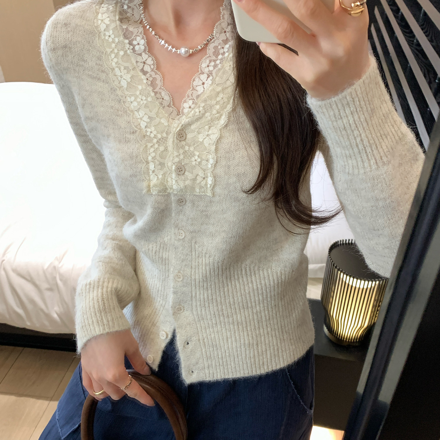 高知miu系蕾丝花边V领羊毛针织毛衣开衫外套女春秋季打底内搭上衣