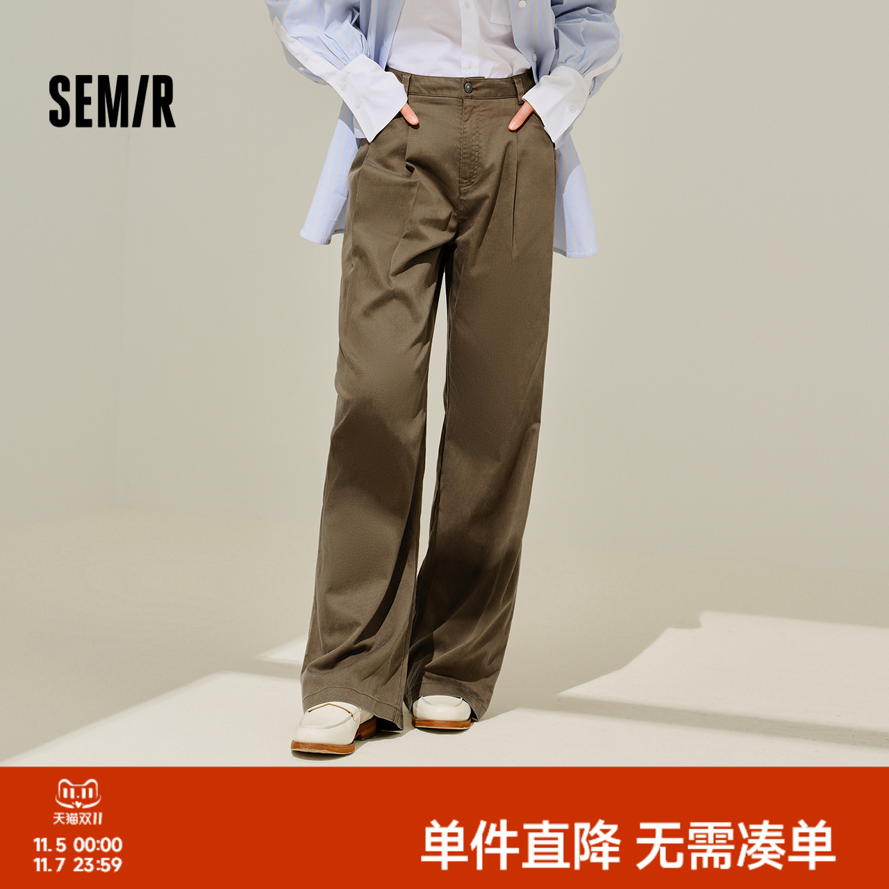 森马休闲裤女纯棉打褶阔腿裤腰带盐系通勤秋季复古磨毛长裤显腿长