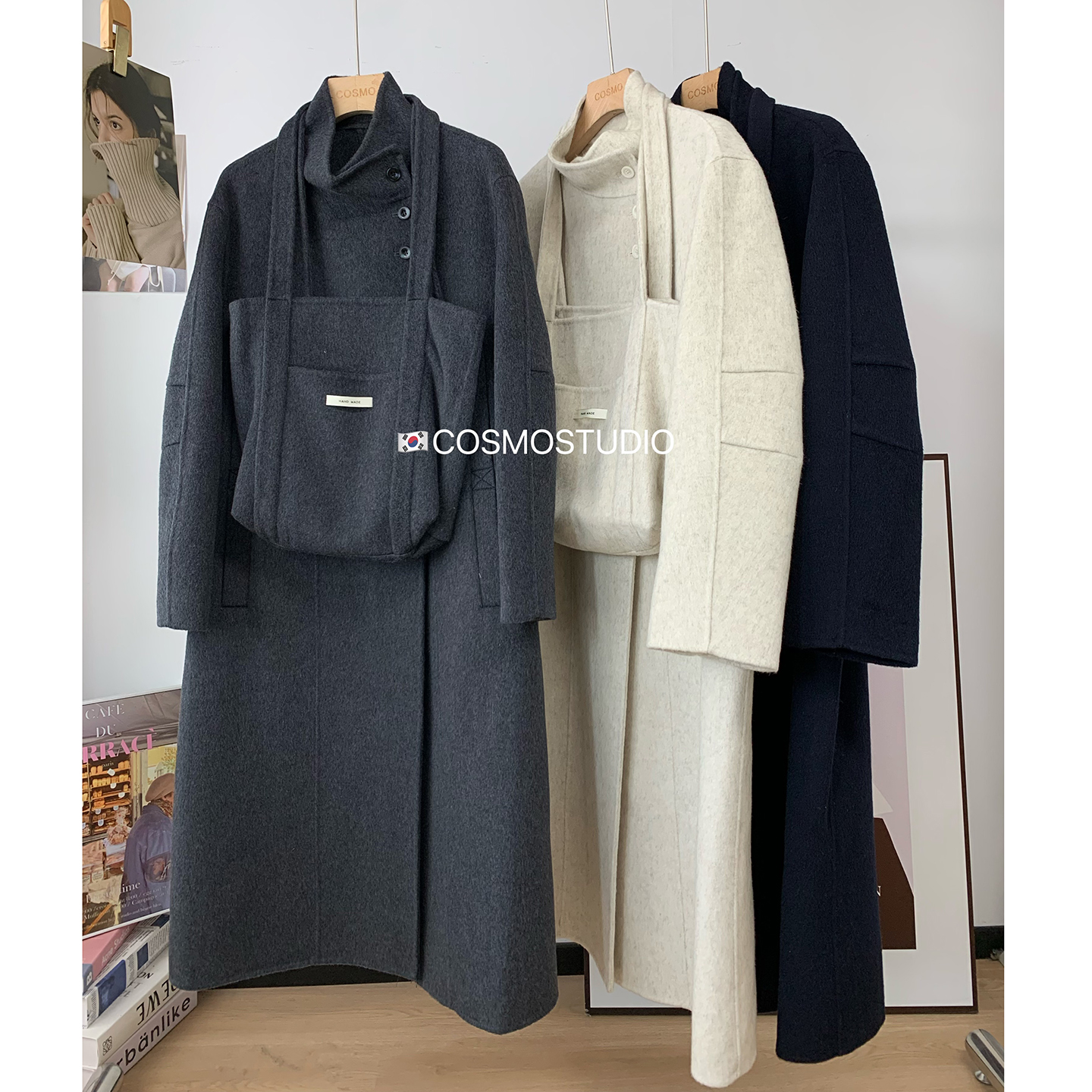 韩国东大门立领双面羊绒毛呢大衣外套女中长款加厚带包包宽松显瘦