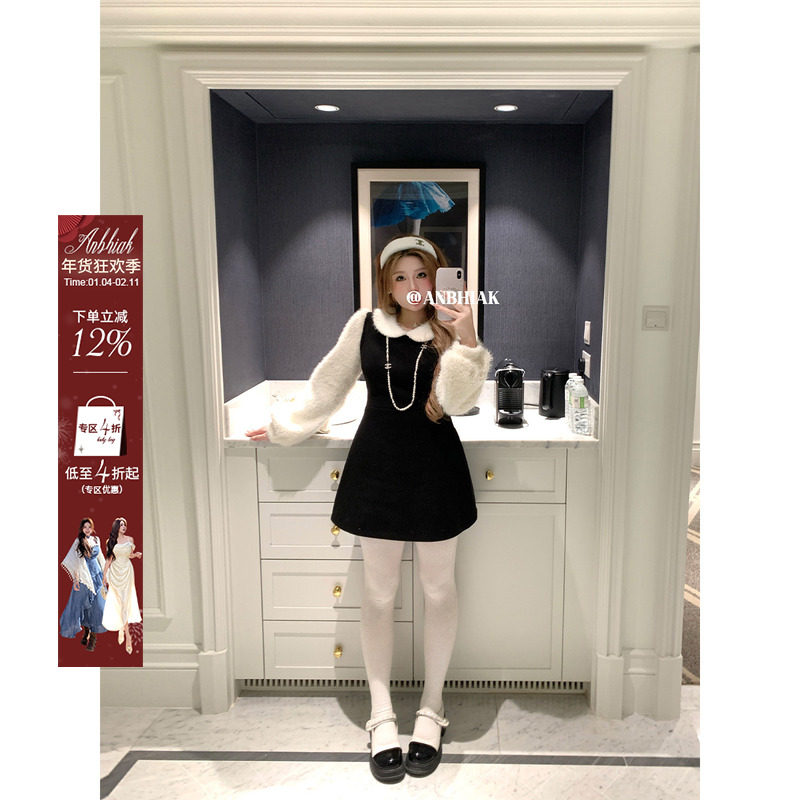 安妮不火 撞色微米短绒拼接呢子连衣裙女微胖大码假两件收腰裙子