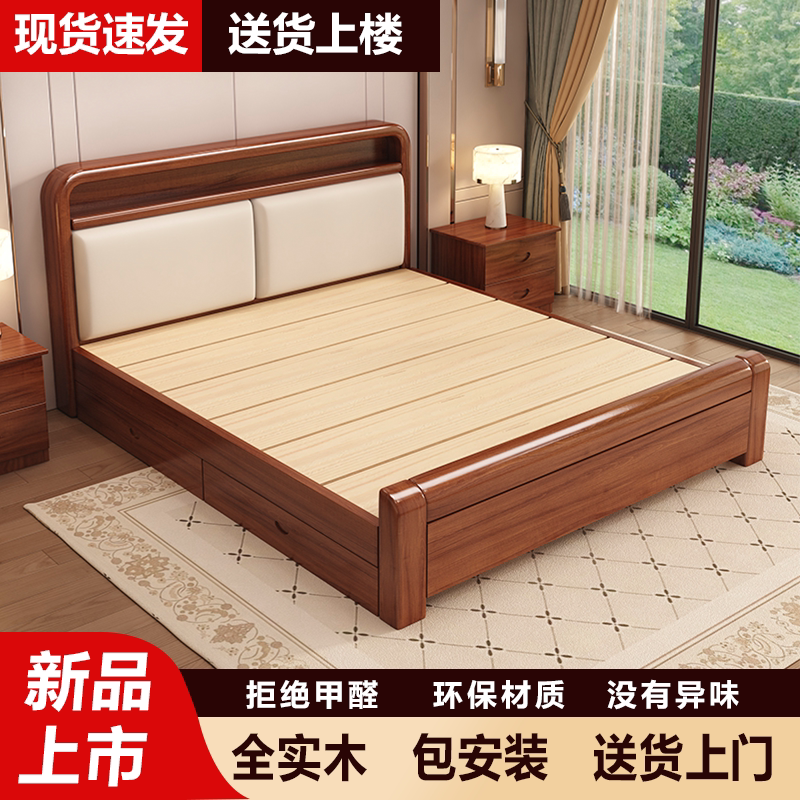 全实木床新中式1米8大床储物主卧经济型1米5家用1.2m单人床出租房