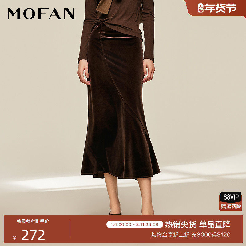 时髦丝绒鱼尾裙女MOFAN摩凡2025秋冬款可可棕遮肉高腰半身裙显瘦