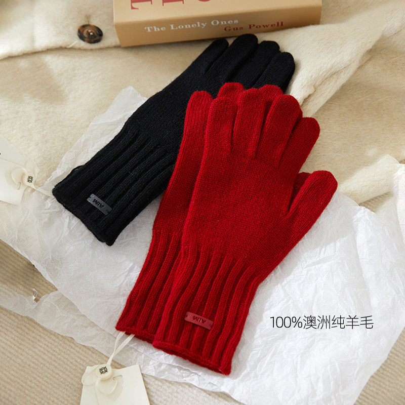 芝士商店~韩系红色纯羊毛手套女冬季保暖可触屏毛线针织五指手套