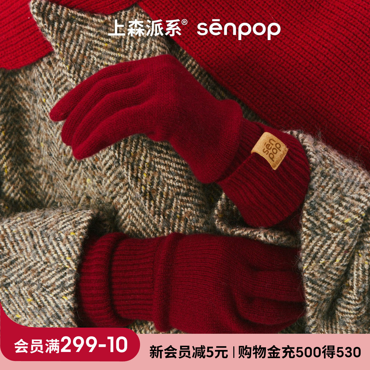 上森羊毛手套可触屏手套秋冬新款女士保暖御寒手套红色针织senpop
