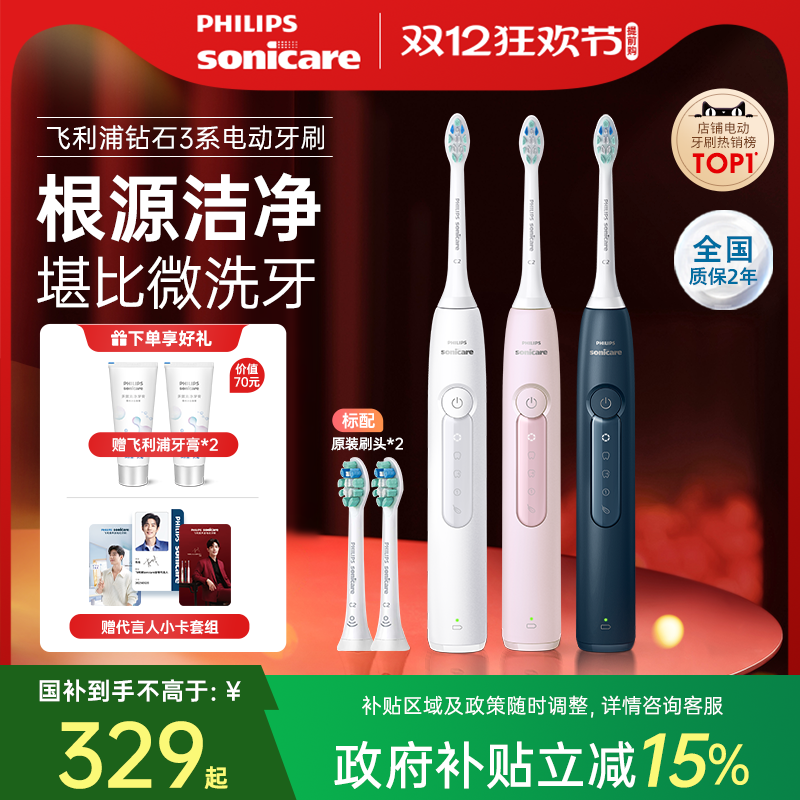 飞利浦电动牙刷成人钻石3全自动声波牙刷圣诞生日礼物官方HX5171