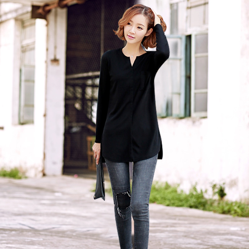 白色V领中长款t恤女长袖纯棉宽松大码开叉上衣磨毛秋冬打底衫体恤