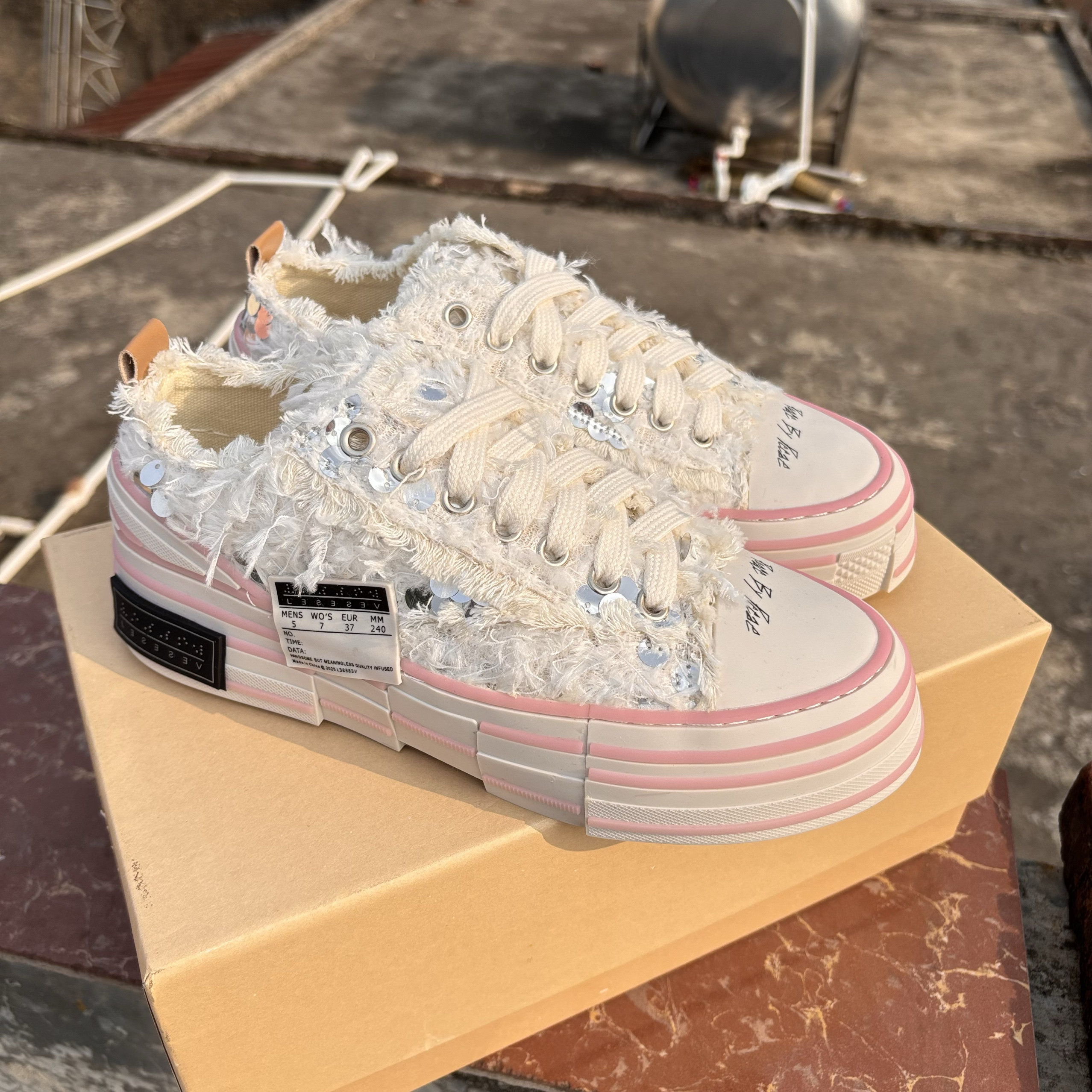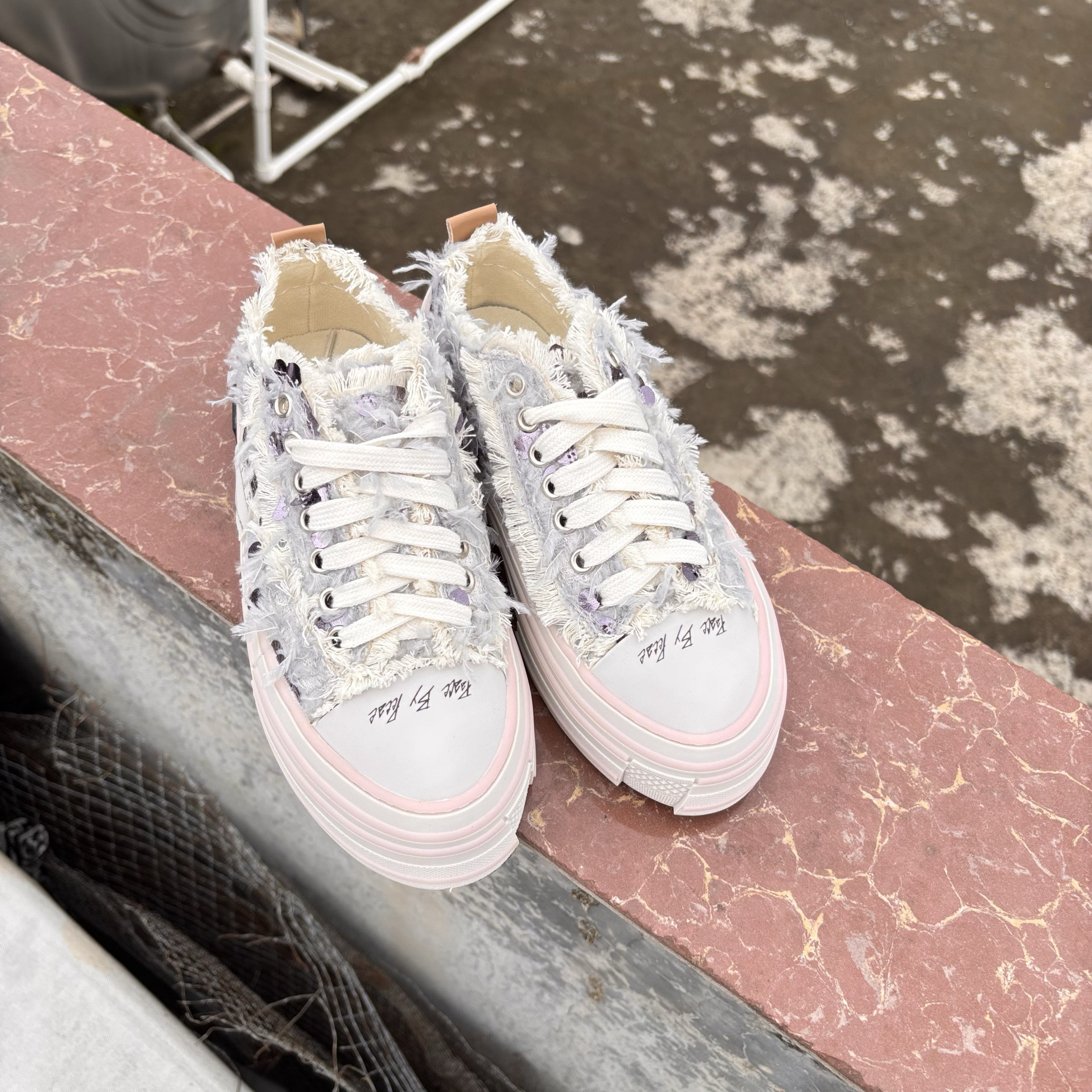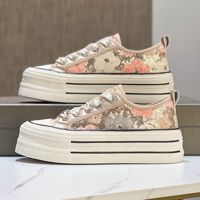 外贸休闲风法式亮片碎边白色帆布鞋女厚底系带百搭透气休闲小白鞋