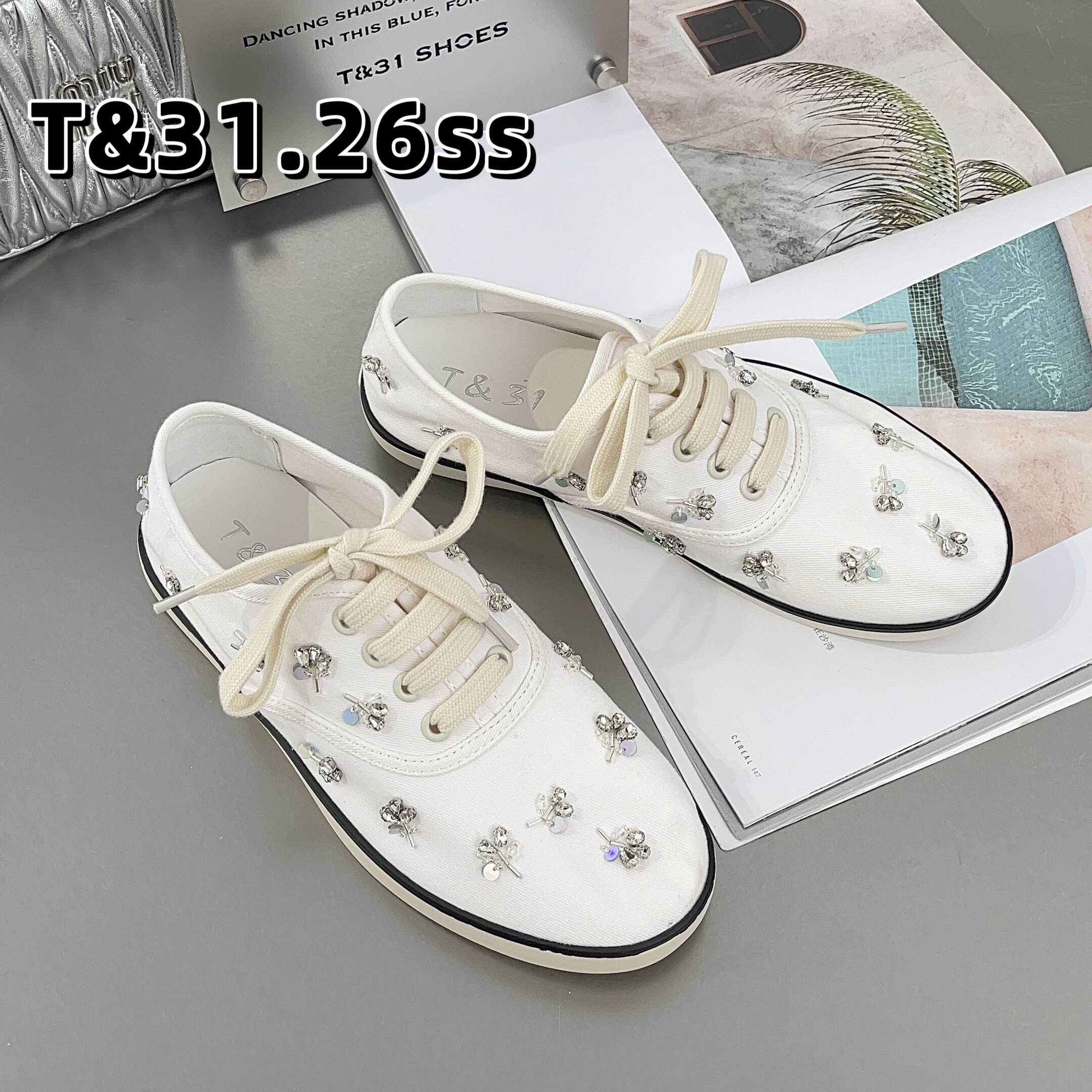 T31女鞋2026夏季新款水钻亮片刺绣帆布鞋平底圆头系带运动休闲鞋