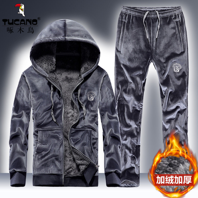 啄木鸟金丝绒套装男士冬季外套加绒保暖加厚运动休闲居家服两件套