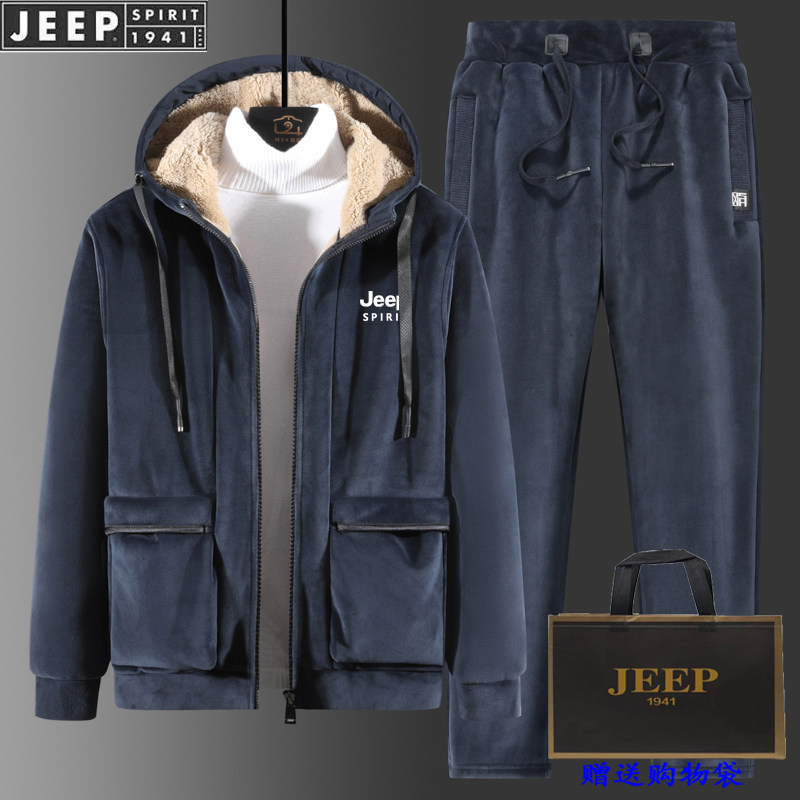 JEEP吉普金丝绒休闲运动套装男冬季羊羔绒加绒加厚大码卫衣两件套