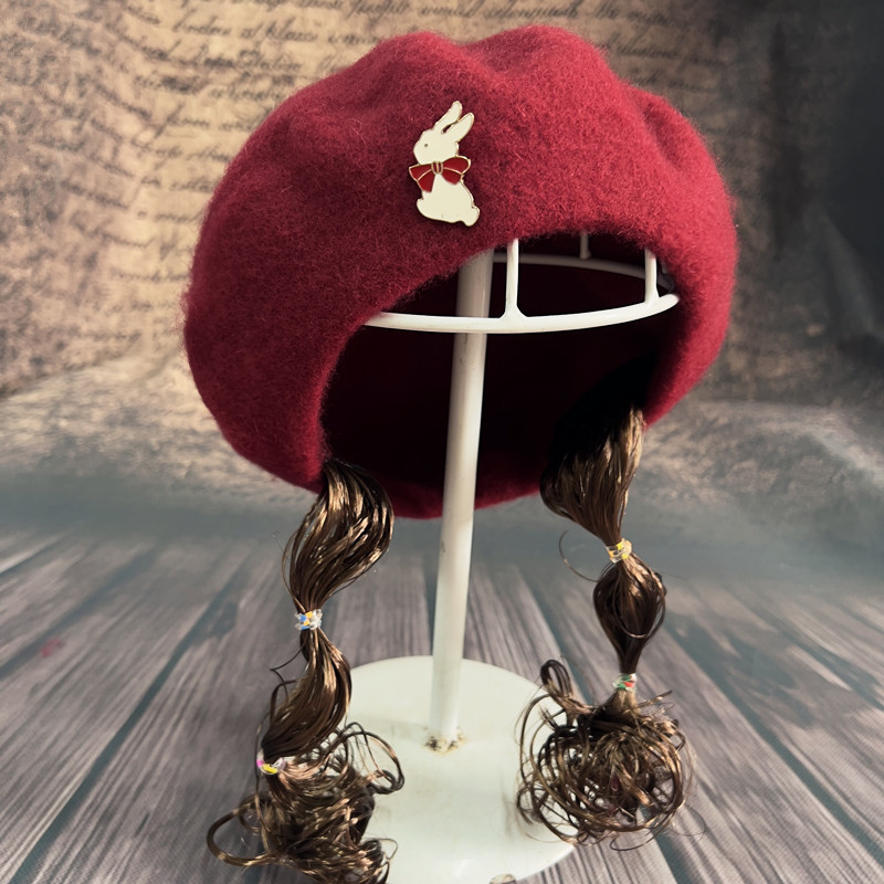 儿童羊毛贝雷帽 女童假发一体帽 春秋冬季女宝宝可爱超萌大童帽子