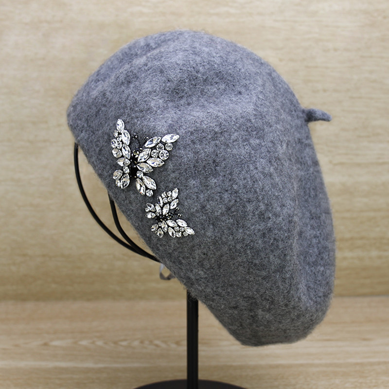 HAKUZU闪钻双蝴蝶羊毛呢贝雷帽 女秋冬小香风蓓蕾帽英伦画家帽子