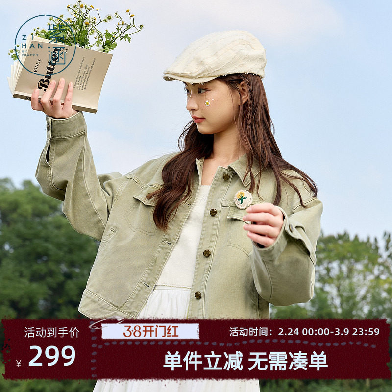 紫涵绿色短款牛仔外套女春秋季新款简约自然清新休闲宽松夹克上衣