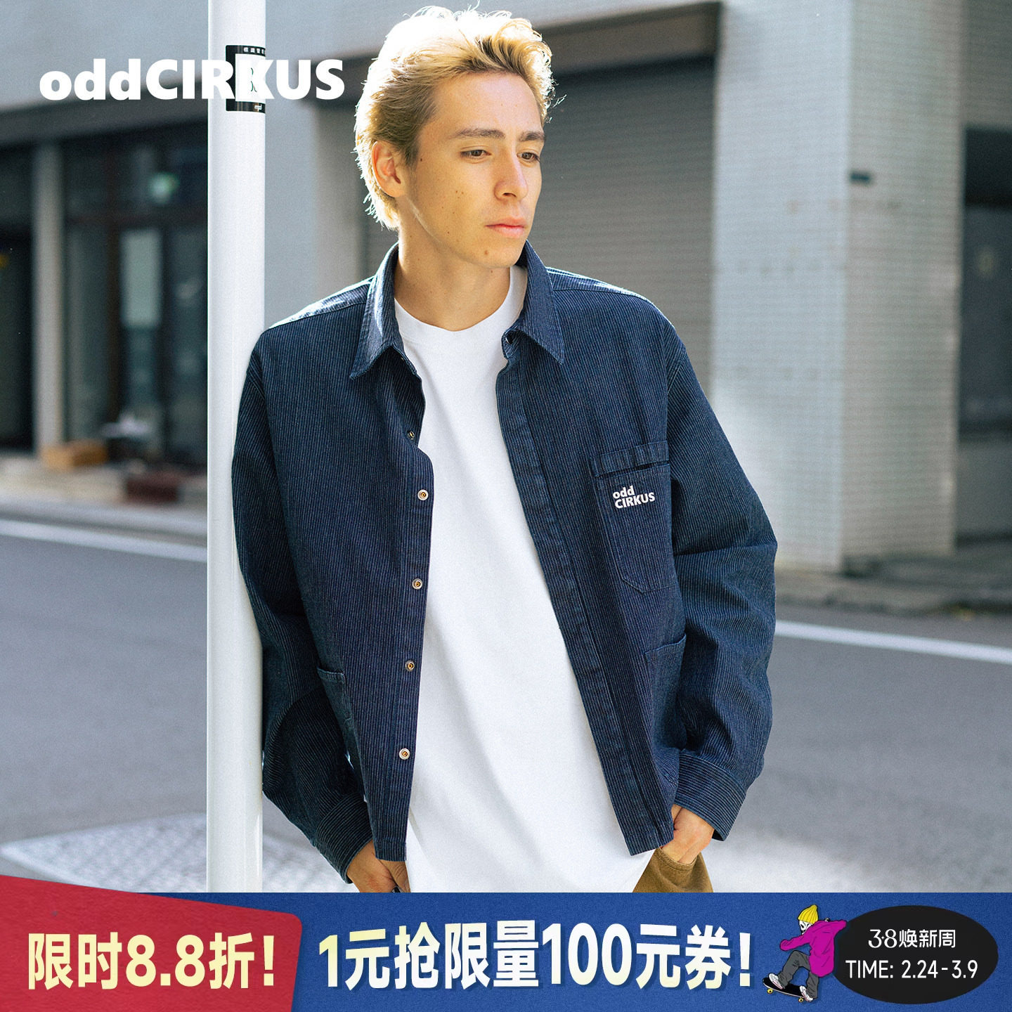 oddCIRKUS蓝牛仔外套 日系街头竖纹短款夹克修身上衣开衫男女同款