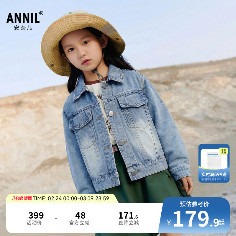 安奈儿童装女童牛仔外套2026春新款时尚休闲短款蝴蝶绣浅蓝色上衣
