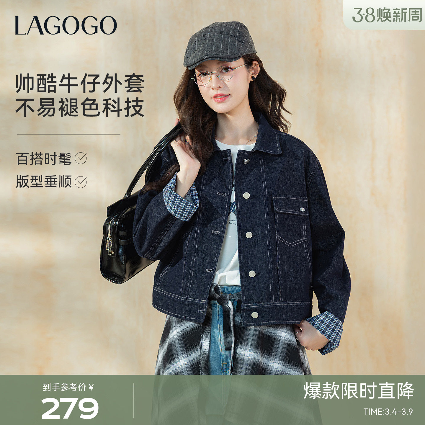 不易褪色LAGOGO靛蓝格袖牛仔外套女拉谷谷2026春新款休闲短款上衣