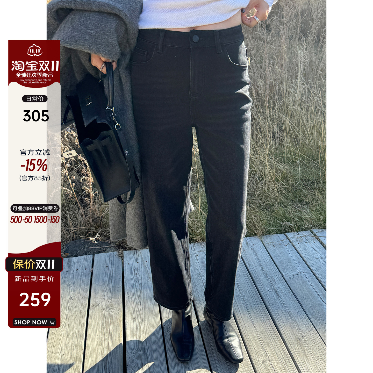 娅丽达加绒直筒裤冬新款牛仔裤女2025小个子九分宽松黑色烟管裤子