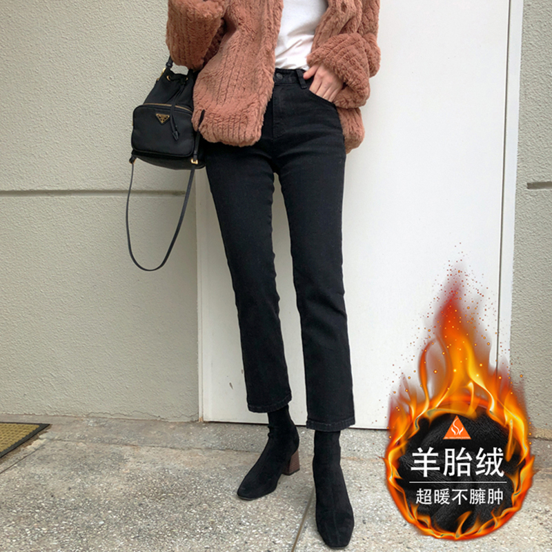 黑色弹力直筒牛仔裤女秋冬加绒大码胖mm高腰宽松显瘦小个子九分裤