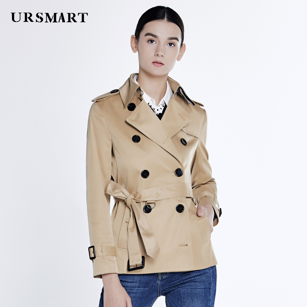 优杰仕双排扣短款风衣女秋季新款女士风衣英伦修身时尚蜂蜜黄外套