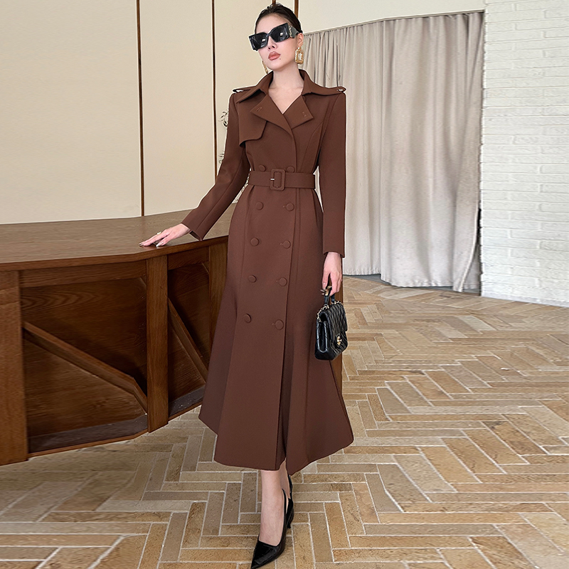 2025秋冬修身气质大衣女式双排扣长款风衣超长黑外套欧美大码女装