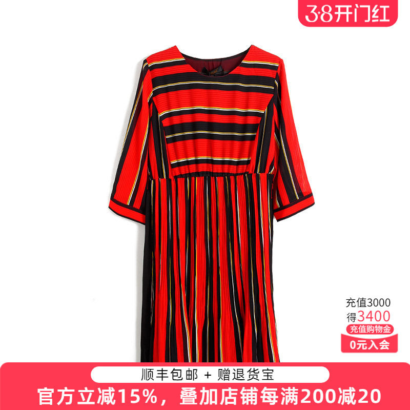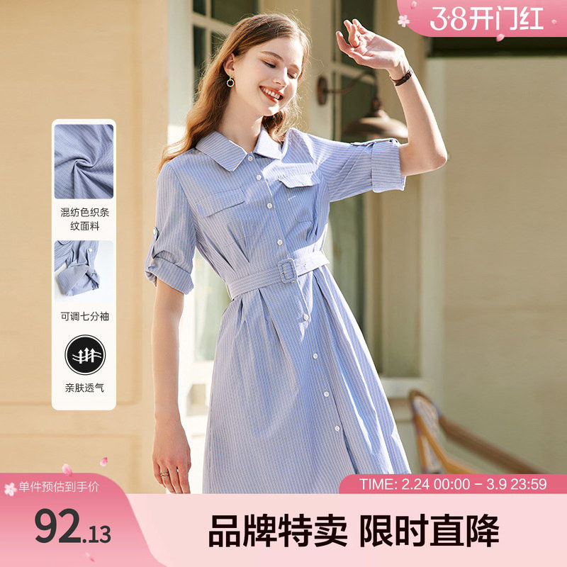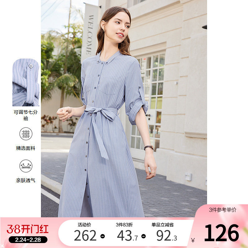 betu百图女装2026年春装新款竖条纹收腰显瘦七分袖中长款连衣裙