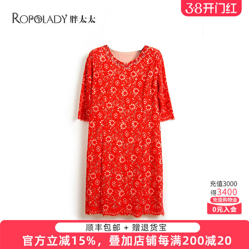 胖太太大码女装巴黎春装新品红色蕾丝七分袖V领连衣裙816219540