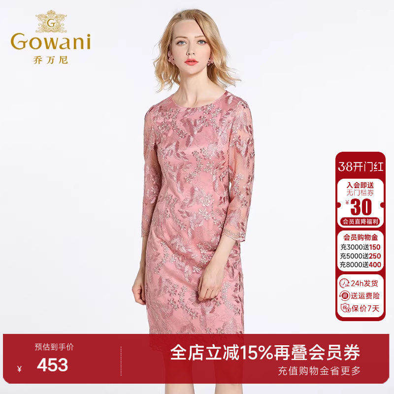 乔万尼春装女商场新款蕾丝气质修身绣花红装七分袖连衣裙中年妈妈