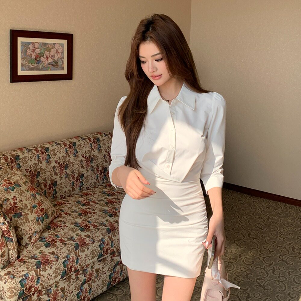 2026春装新款纯白色七分袖显瘦气质通勤连衣裙女衬衫包臀短裙