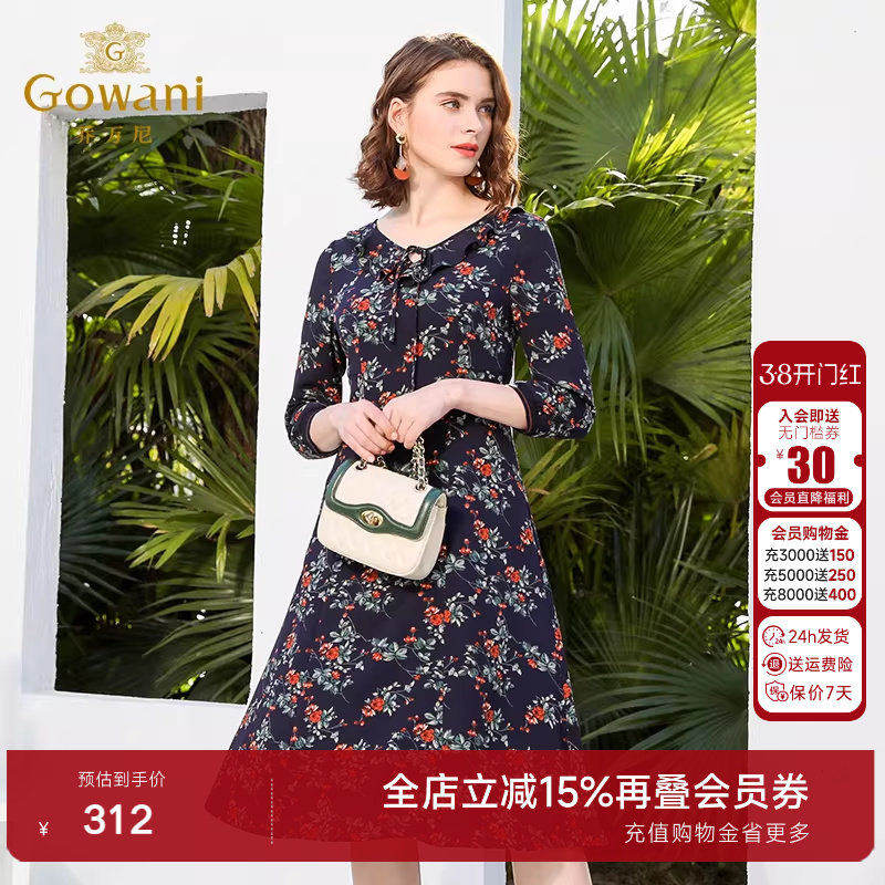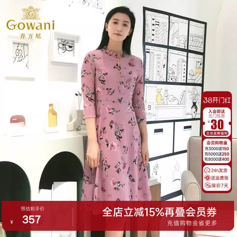 乔万尼春装女商场新款修身收腰气质七分袖中年女士印花连衣裙长裙