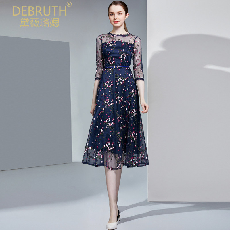 黛薇璐媤蓝色绣花网纱连衣裙女2026春装新款气质收腰七分袖礼服裙