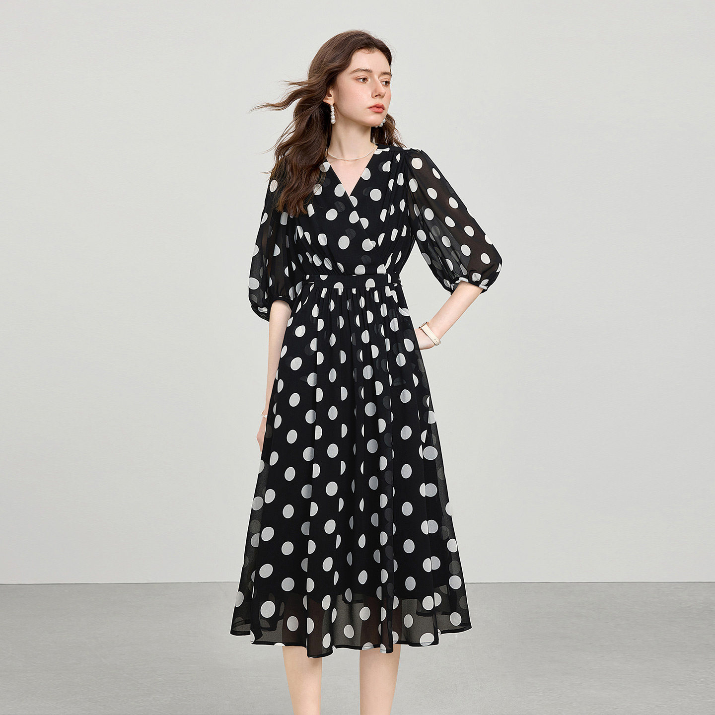 尘埃之家2025春装新款女雪纺通勤韩版连衣裙中长款夏七分袖裙女