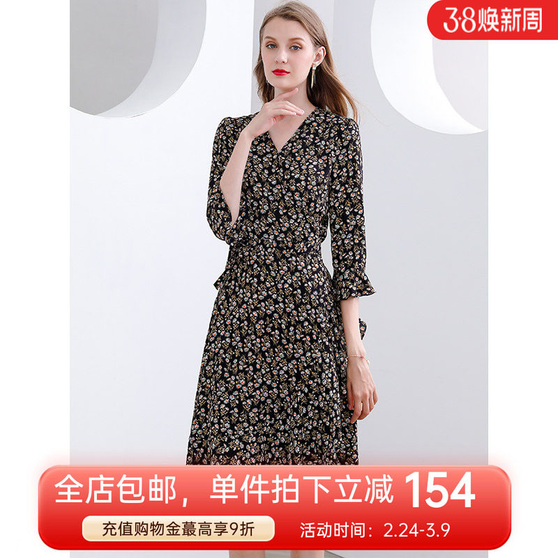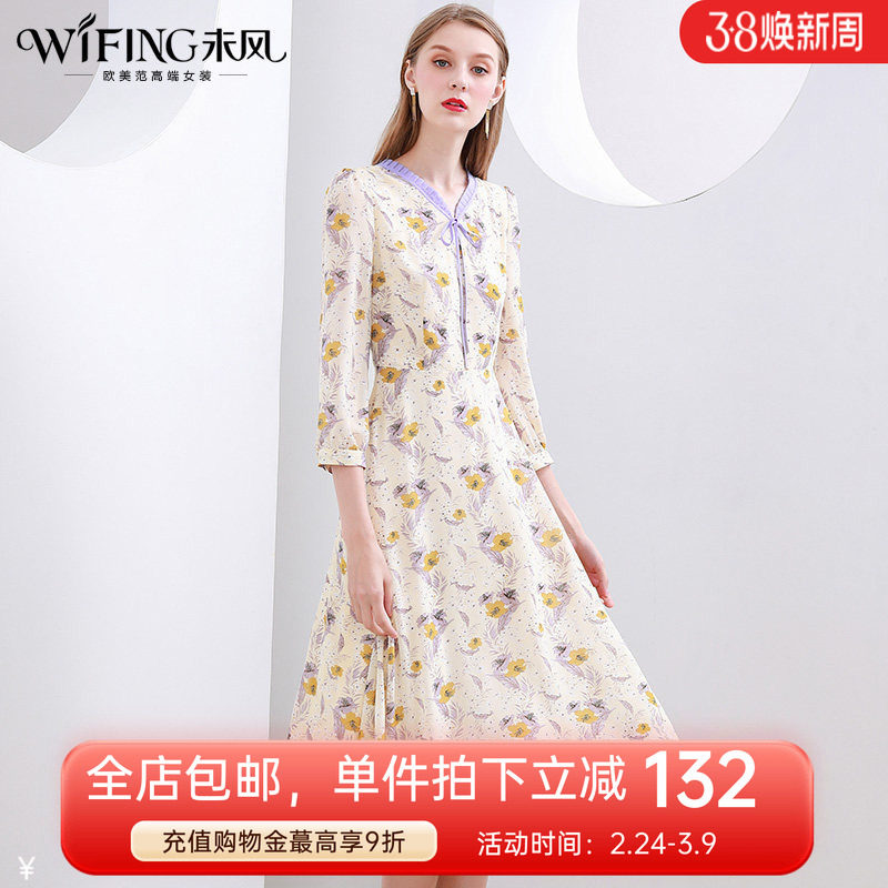 未风碎花雪纺连衣裙女春2026春装新款七分袖收腰显瘦气质长款长裙