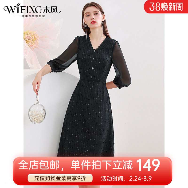 未风雪纺黑色连衣裙女春2026春装新款七分袖气质女装新品时尚裙子