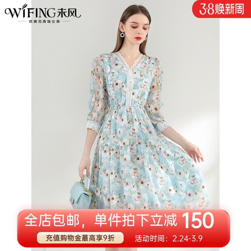 未风蓝色V领雪纺印花连衣裙女春2026春装新款七分袖高腰显瘦裙子